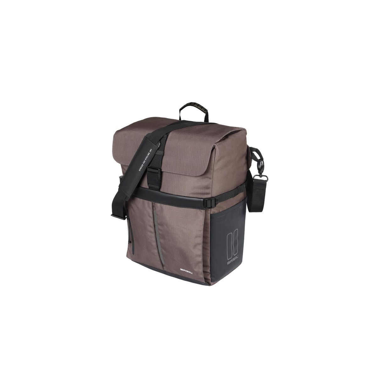 Plus d'informationsSacoche de porte-vélo Basil Move avec crochets MIK - Simple Bag - 15 litres - Marron. Sportive et fonctionnelle, la sacoche Move est idéale pour vos trajets quotidiens et vos voyages. D'un volume de 15 litres, elle comprend un compartiment rembourré pour ordinateur portable, des poches latérales élastiques et des poches zippées supplémentaires. Fabriquée en polyester recyclé déperlant, elle est livrée avec une housse de pluie. Sa bandoulière amovible vous permet de la transporter facilement où que vous alliez. Découvrez la praticité des crochets MIK, un système innovant qui vous permet d'attacher et de changer facilement et rapidement des accessoires sur votre porte-bagages. Grâce aux crochets MIK, vous pouvez fixer solidement une sacoche ou un panier sur le côté de votre porte-bagages. Vous pouvez monter et démonter n'importe quelle sacoche en quelques secondes, sans craindre d'endommager votre porte-bagages. Caractéristiques : - Capacité pratique et compacte de 15 litres - Fabriqué en polyester recyclé hydrofuge - Compartiment rembourré pour transporter votre ordinateur portable en toute sécurité - Poches latérales élastiques, poche supplémentaire pour casque, poches zippées et compartiments internes pour un espace de rangement maximal - Bandoulière amovible pour un transport plus confortable - Housse de pluie hydrofuge incluse - Fixation facile grâce au système MIK Studs - Détails réfléchissants pour une meilleure visibilité